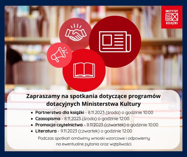 Spotkanie online, na którym zostanie omówiony wniosek wzorcowy z zakresu programu Partnerstwo dla książki 2024, odbędzie się za pośrednictwem platformy Zoom w dniu 8.11.2023 (środa) o godzinie 10:00.