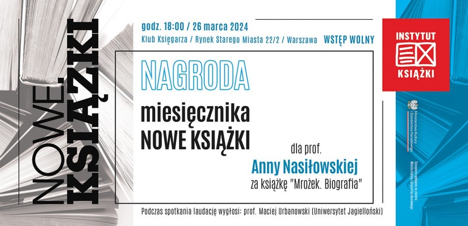 Redakcja miesięcznika „Nowe Książki” oraz Instytut Książki mają zaszczyt zaprosić na uroczyste wręczenie Nagrody Miesięcznika „Nowe Książki” prof. Annie Nasiłowskiej za książkę „Mrożek. Biografia” (Wydawnictwo Literackie, Kraków 2023).